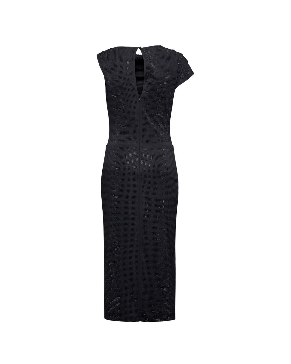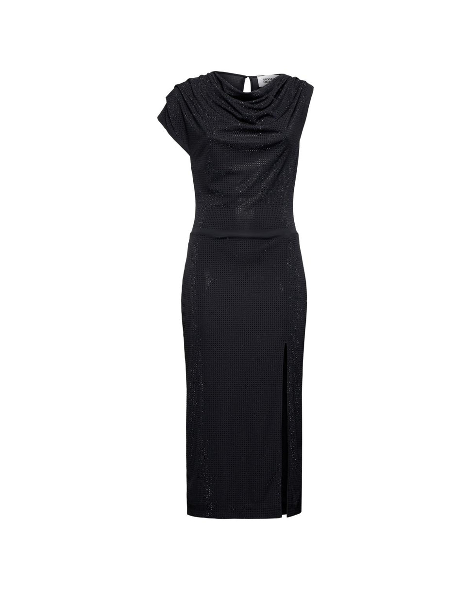 Un abito lungo e sofisticato, caratterizzato da una spalla scoperta e drappeggio morbido. Il dettaglio dello spacco laterale dona movimento e intensità al look.