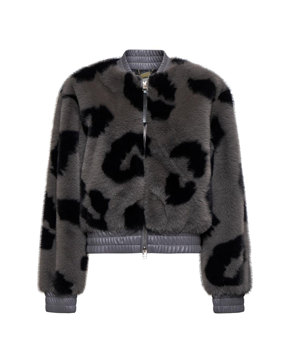 Bomber corto in pelliccia sintetica con stampa irregolare e zip frontale. Un capo di carattere dall’anima urbana.