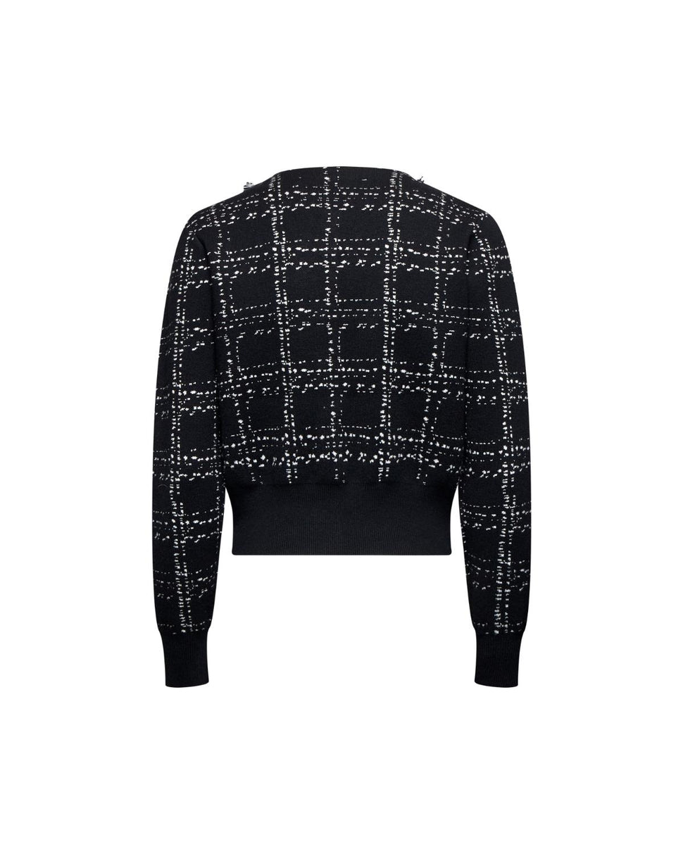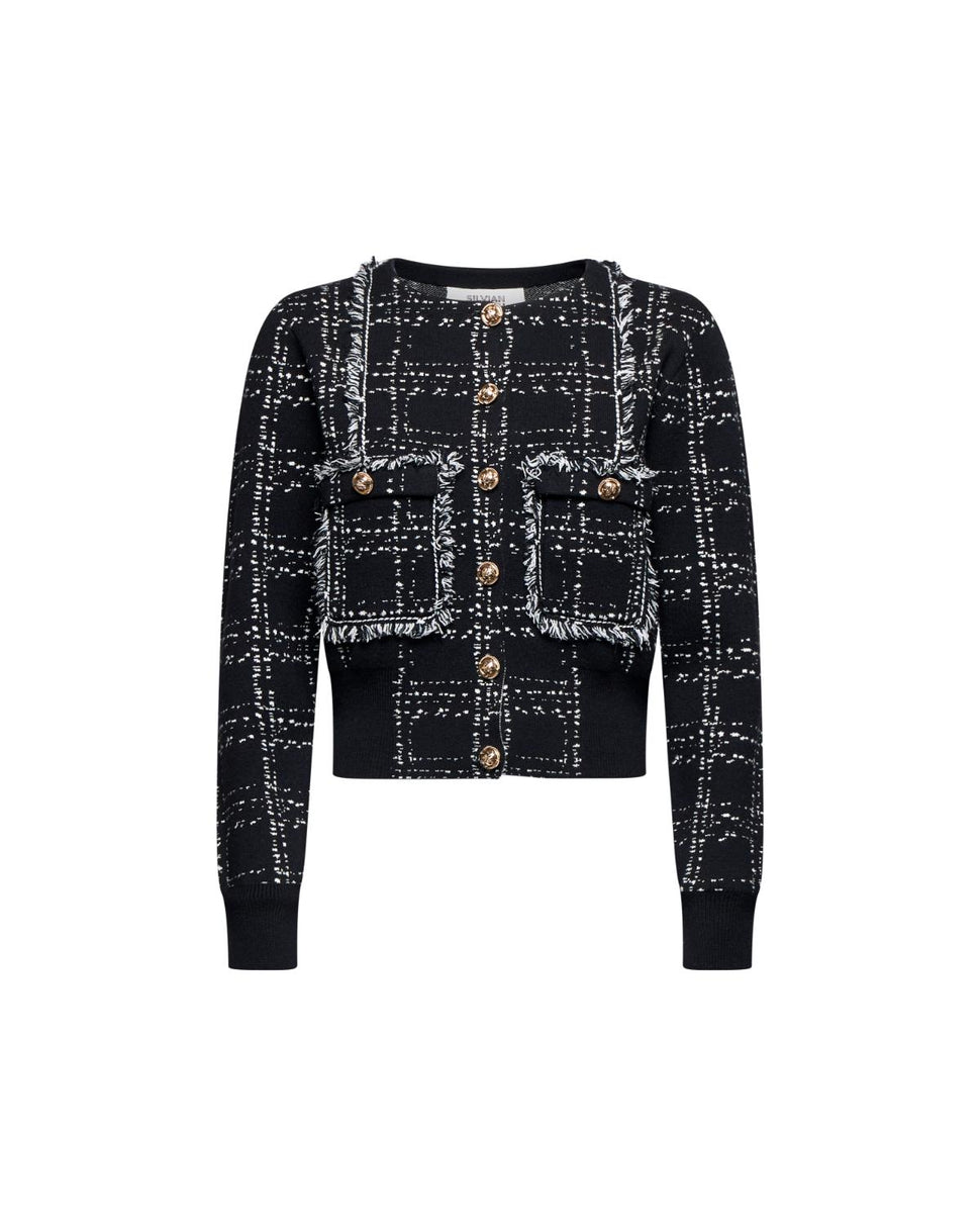 Cardigan corto con lavorazione che richiama l’effetto tweed. I bottoni gioiello e le tasche applicate definiscono il design.