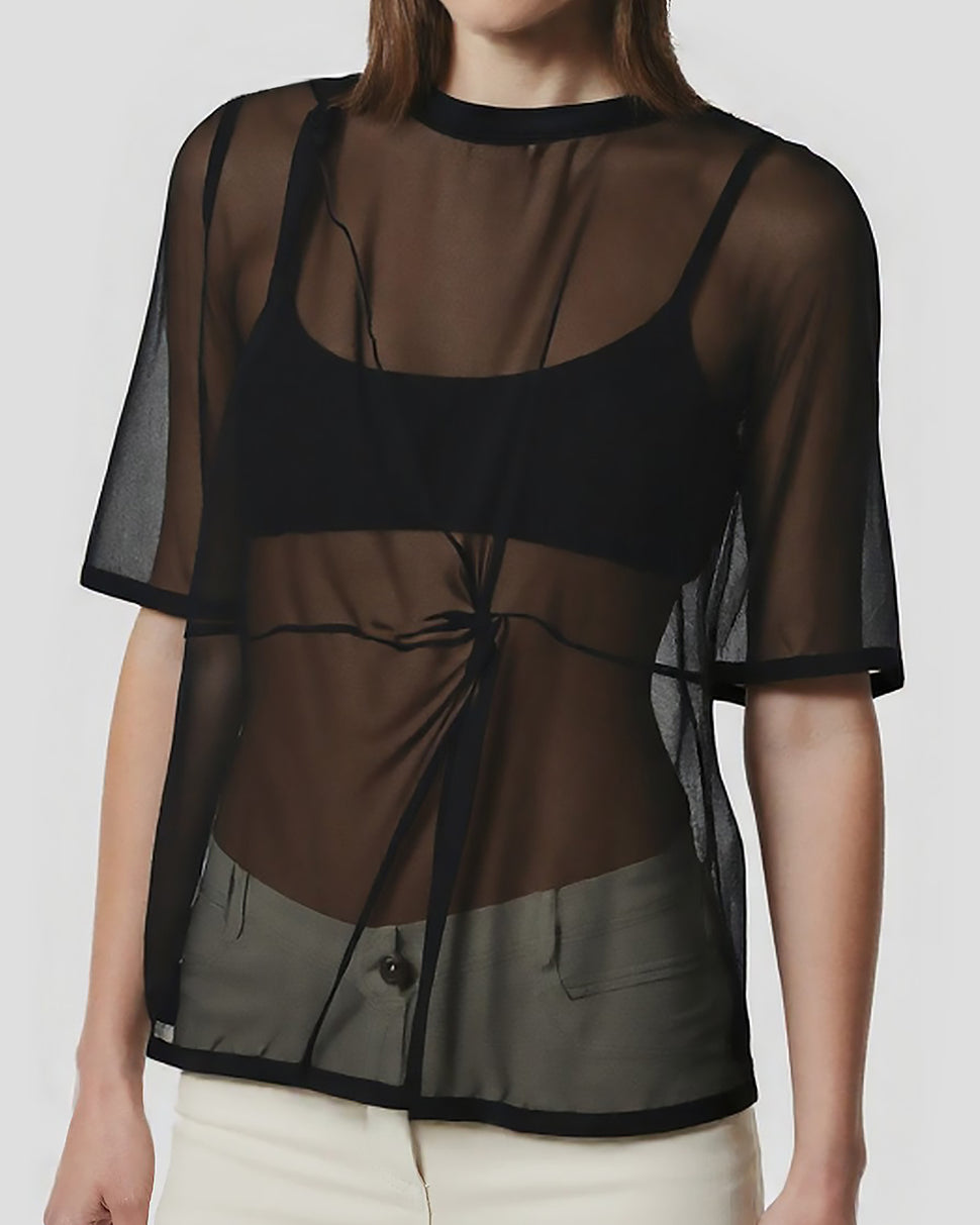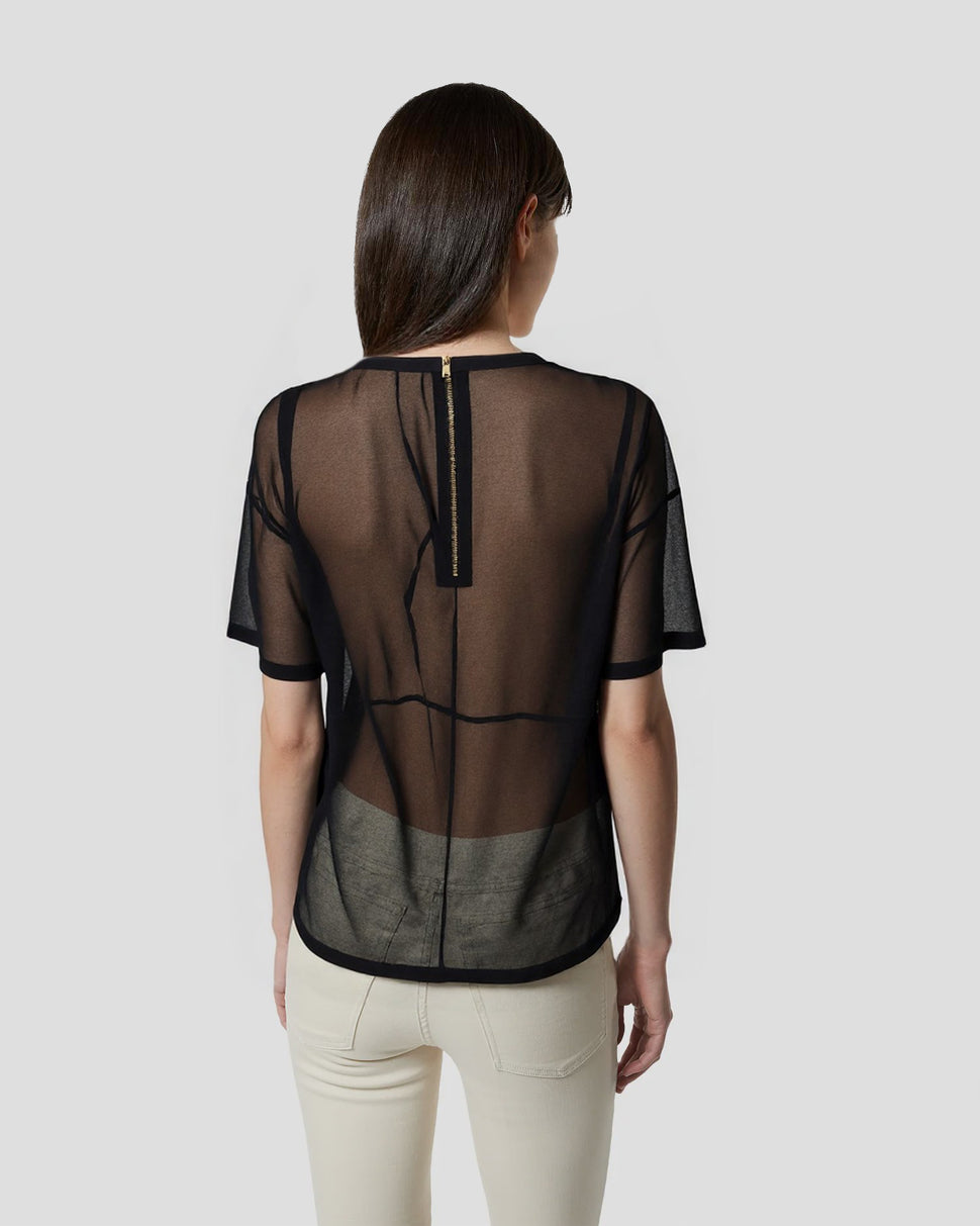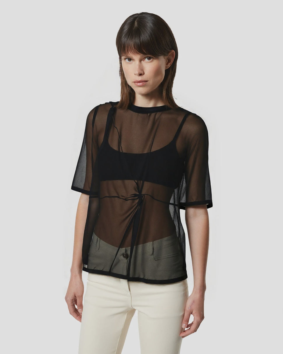 Un capo essenziale reinterpretato con raffinatezza. Questa blusa gioca con trasparenze sulle spalle e un'applicazione floreale tono su tono sullo scollo posteriore, per un look femminile e contemporaneo. Perfetto da abbinare a pantaloni sartoriali o gonne midi per un'eleganza senza sforzo.