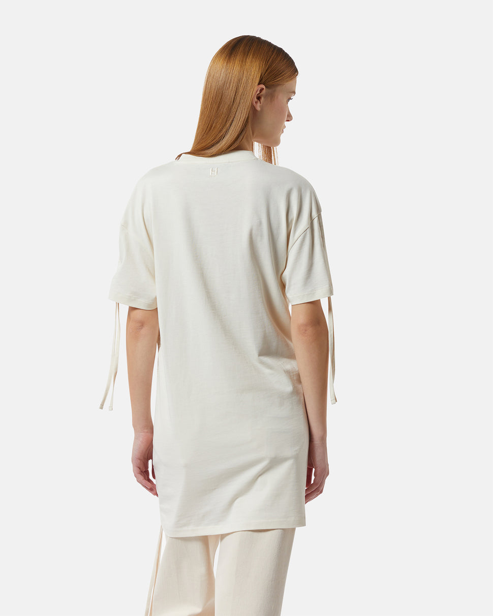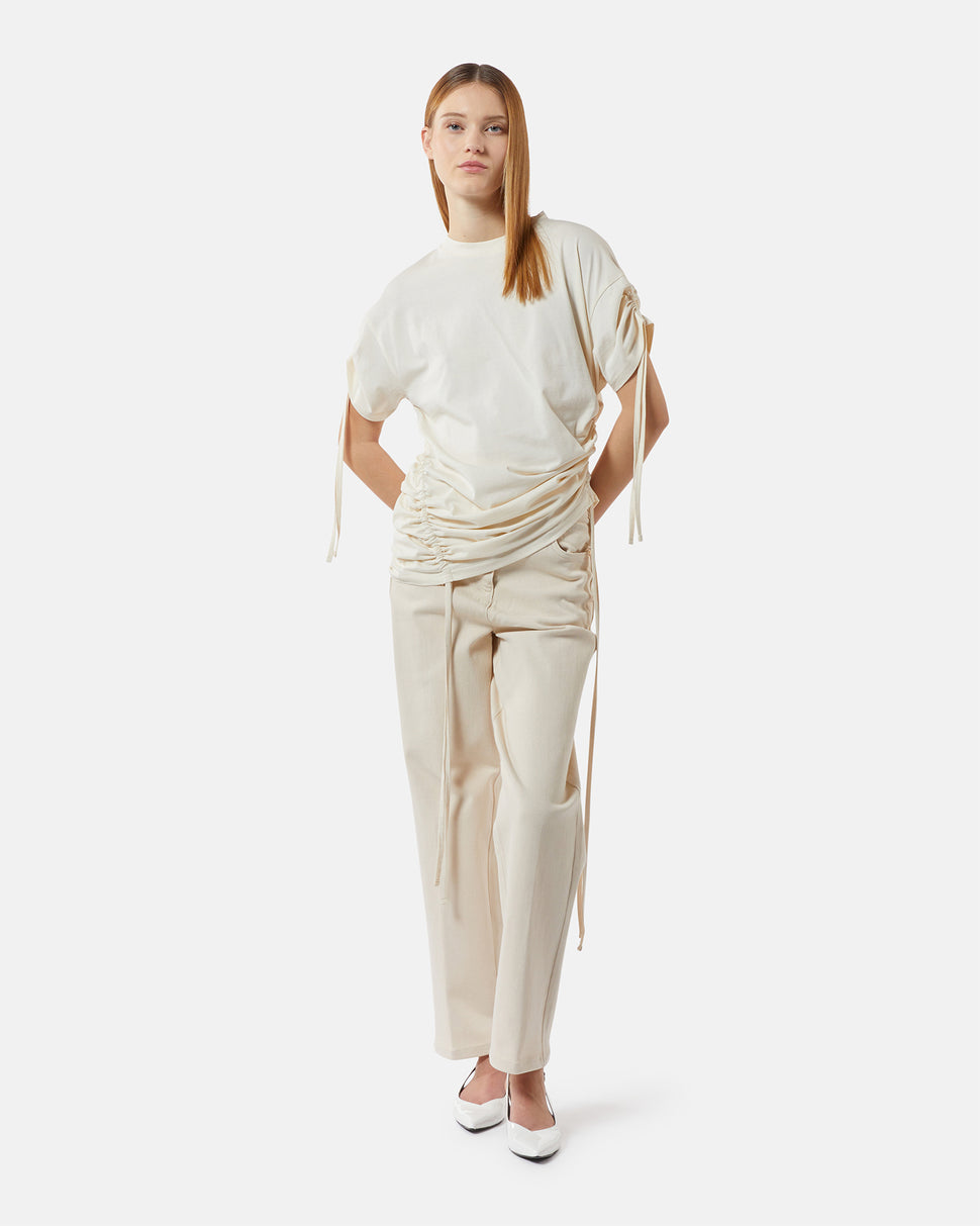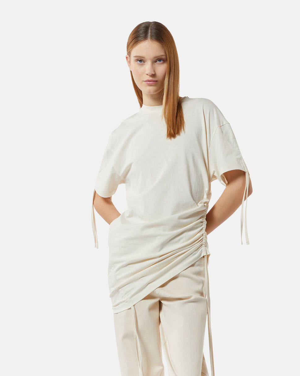 Questa t-shirt in cotone reinventa il classico stile casual con dettagli moderni come l’arricciatura laterale regolabile e le maniche con laccetti, per un look dinamico e personalizzabile.