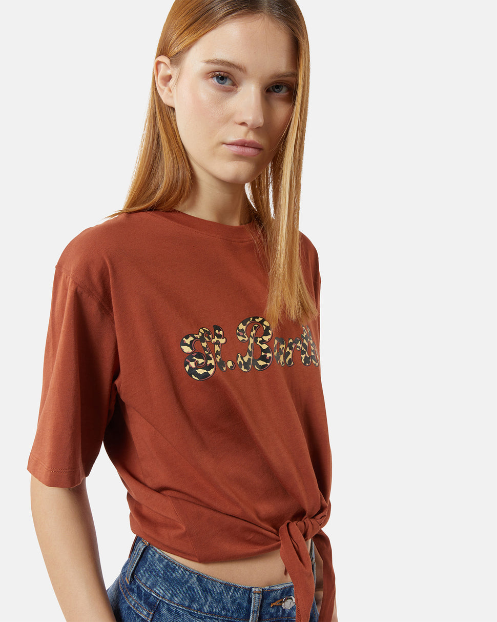 Una t-shirt casual e alla moda, caratterizzata dal logo ricamato sul davanti e da un elegante nodo in vita che dona un tocco moderno al look. Perfetta per un outfit estivo fresco e trendy.