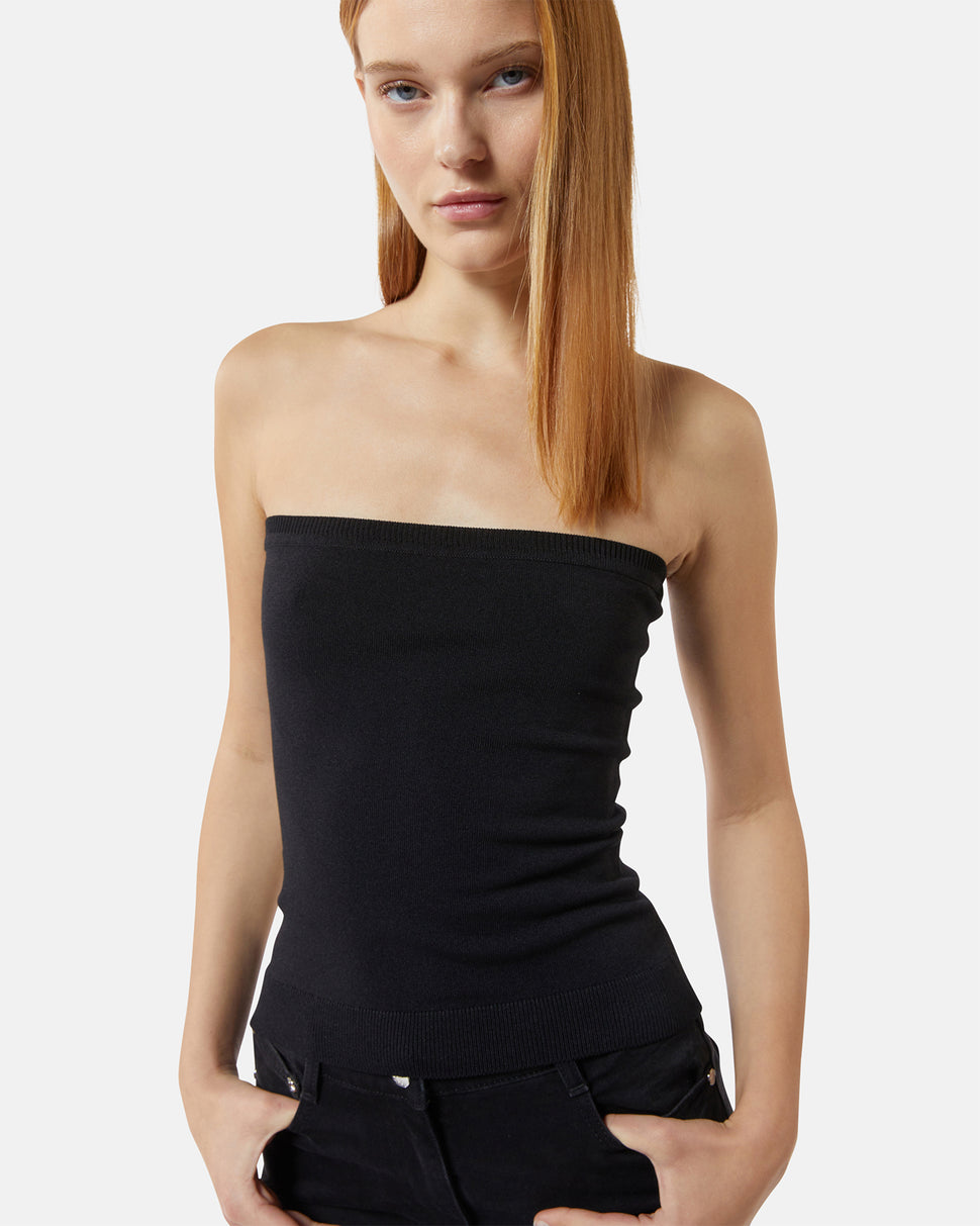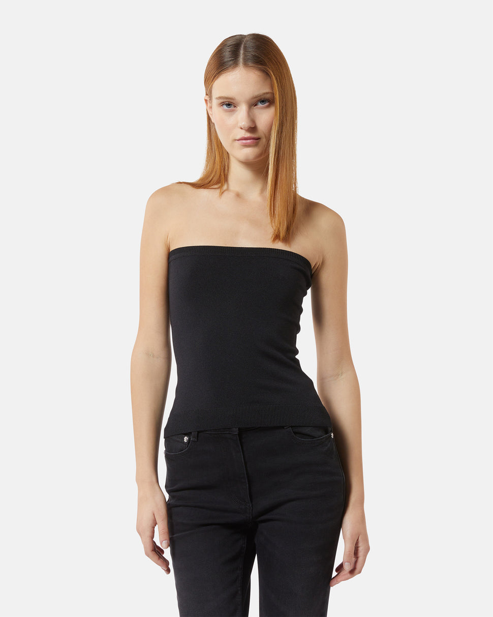 Un capo semplice e versatile, questo top senza spalline in maglia elasticizzata è perfetto per creare look freschi e comodi.