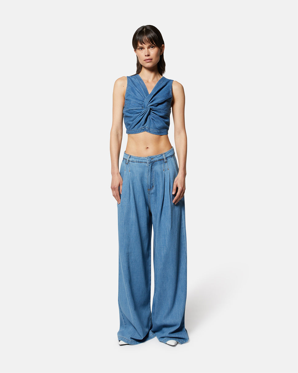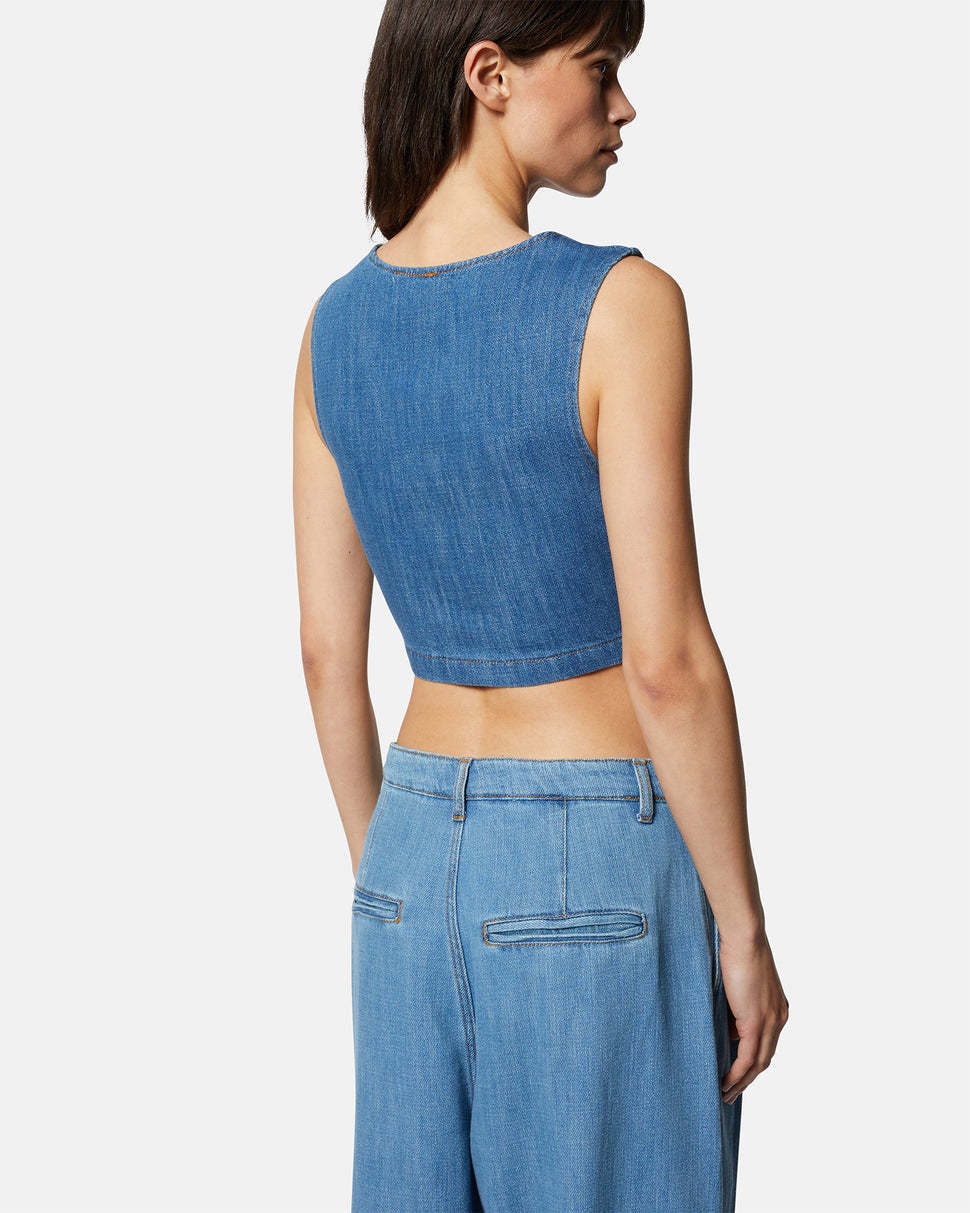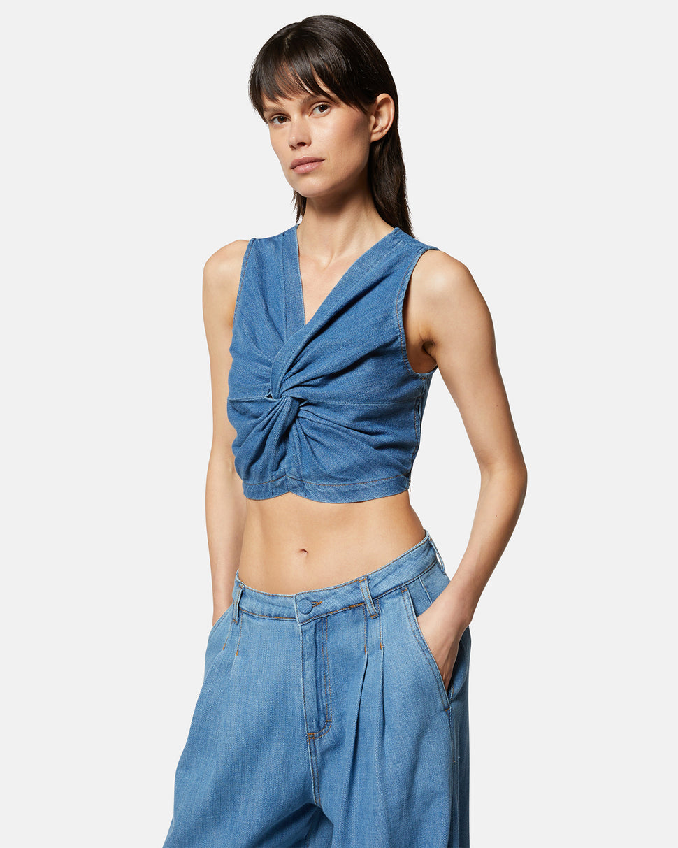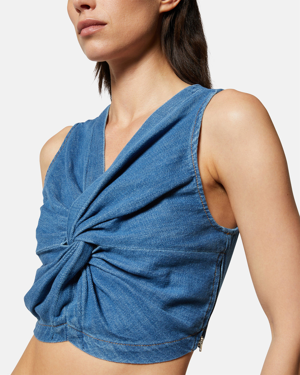Un top moderno e fresco in denim, caratterizzato da un originale nodo centrale che crea un effetto avvolgente e affusolato. Perfetto per un look casual ma ricercato, ideale per l'estate o per le serate informali.