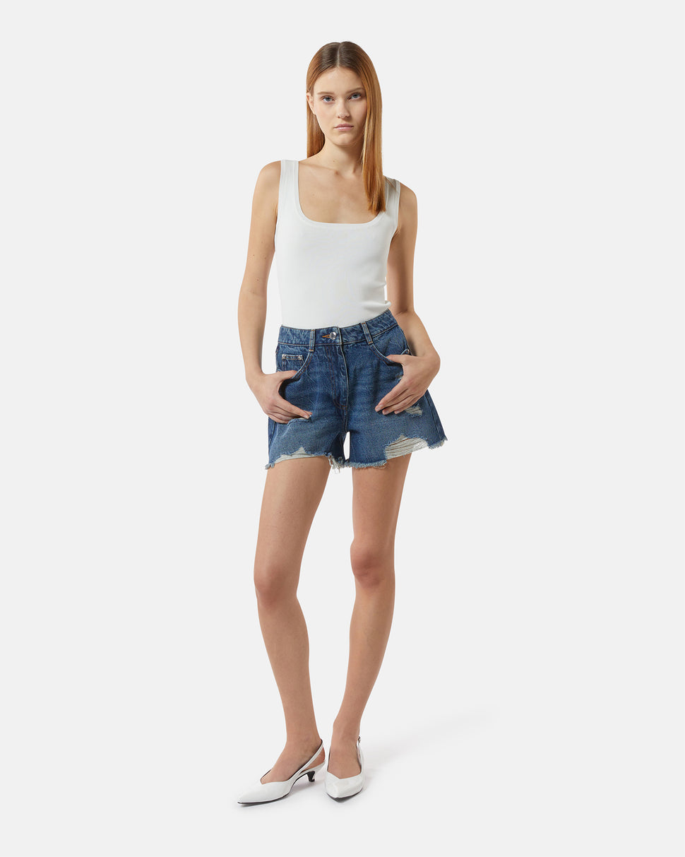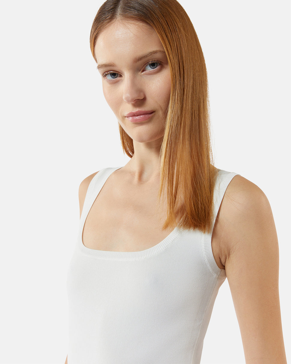 Un capo essenziale per ogni guardaroba, questo top in maglia si distingue per la sua silhouette aderente e il raffinato scollo squadrato, perfetto per valorizzare il décolleté.