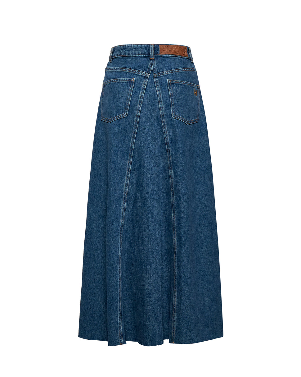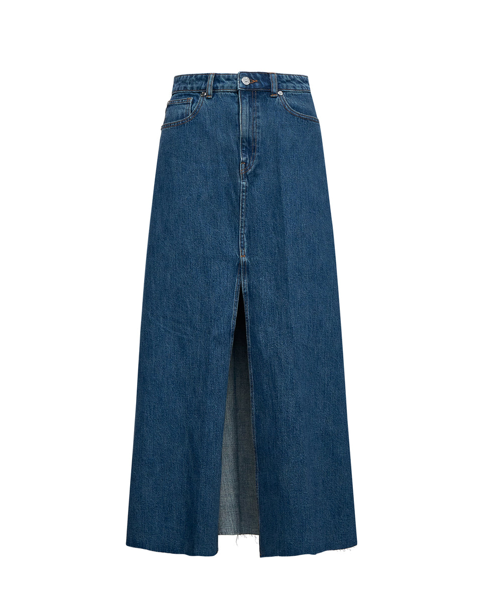 A denim midi skirt with a center front slit. Clean lines, a straight silhouette, and utility inspiration.