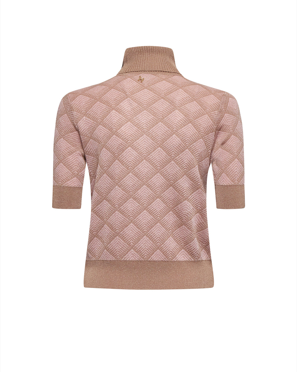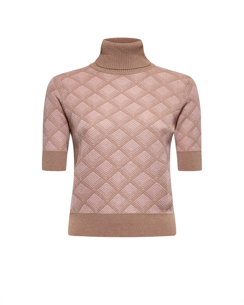 A turtleneck sweater with short sleeves, featuring a regular diamond pattern. A compact and graphic take on a knitwear classic.