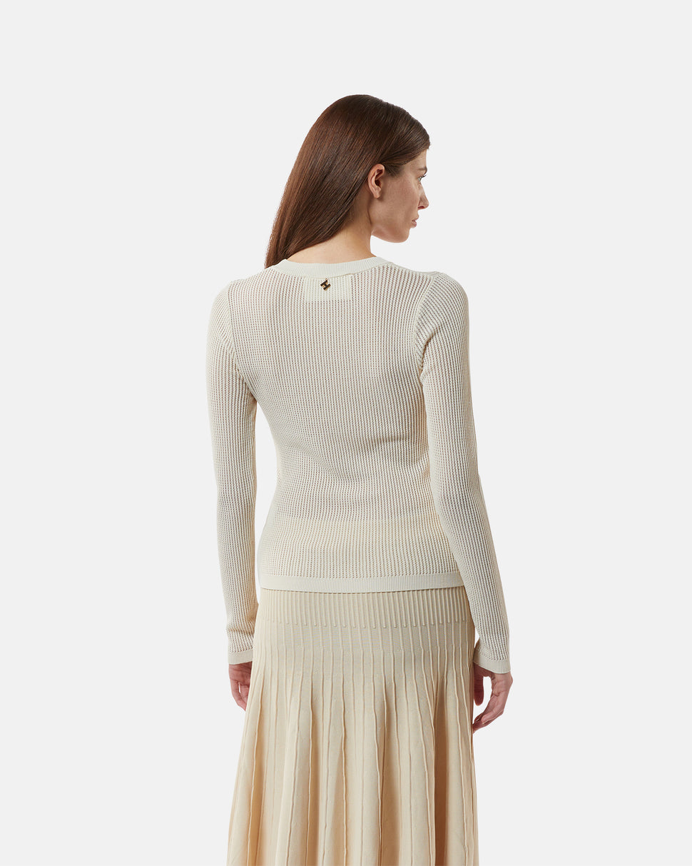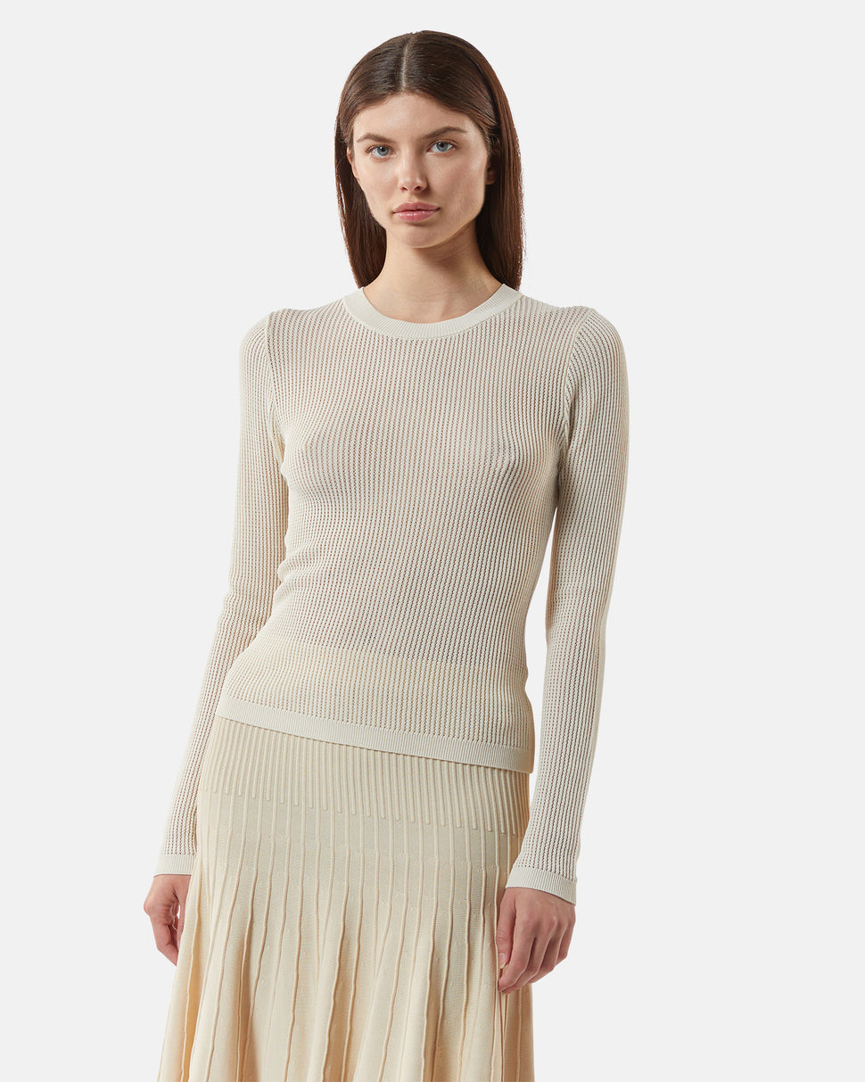 Top -fledged shirt with a sophisticated and light design, perfect for adding a touch of elegance to daily looks. The processing in small holes creates a semi-transparent effect that gives femininity and lightness to the head, making it ideal to be worn both by itself and overlapped. The round neckline and long sleeves guarantee a comfortable fit, while the soft fit ensures excellent freedom of movement.