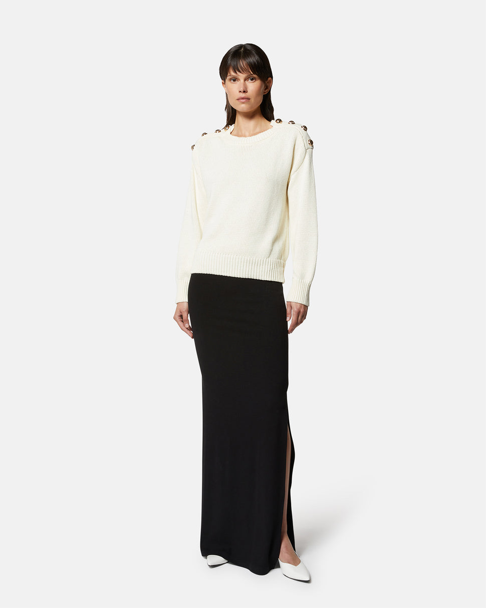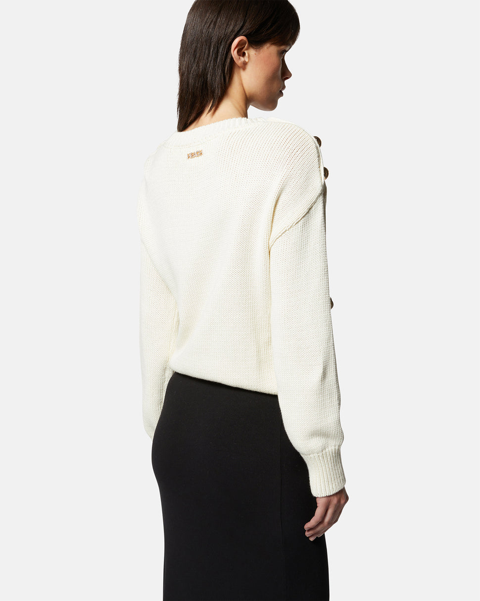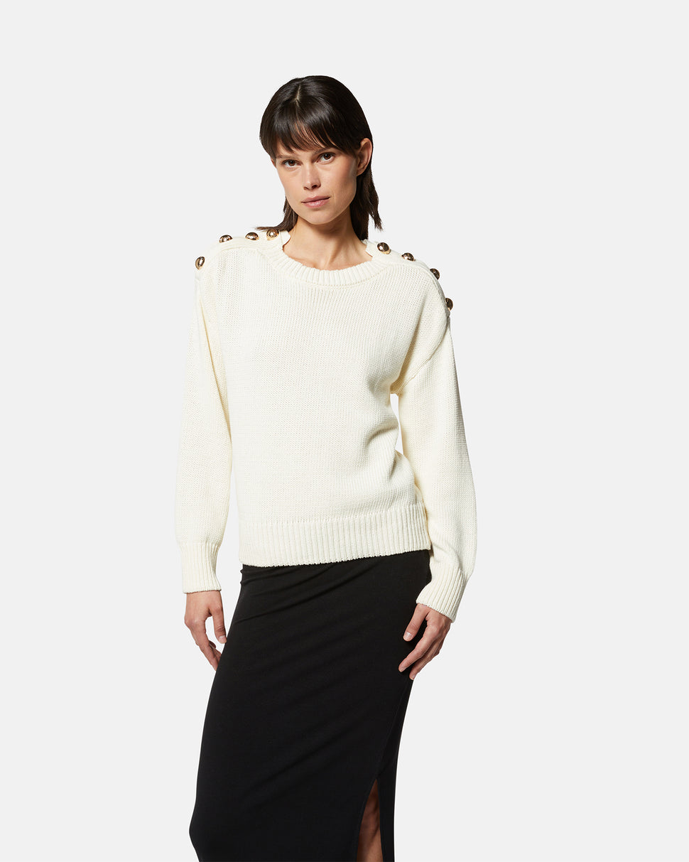 A sophisticated and versatile garment that adds a touch of elegance to your daily looks. This jersey sweater is embellished with decorative buttons on the shoulders, giving a refined and chic detail. The soft fit makes it perfect for every occasion, to be combined with jeans or skirts for an impeccable style.