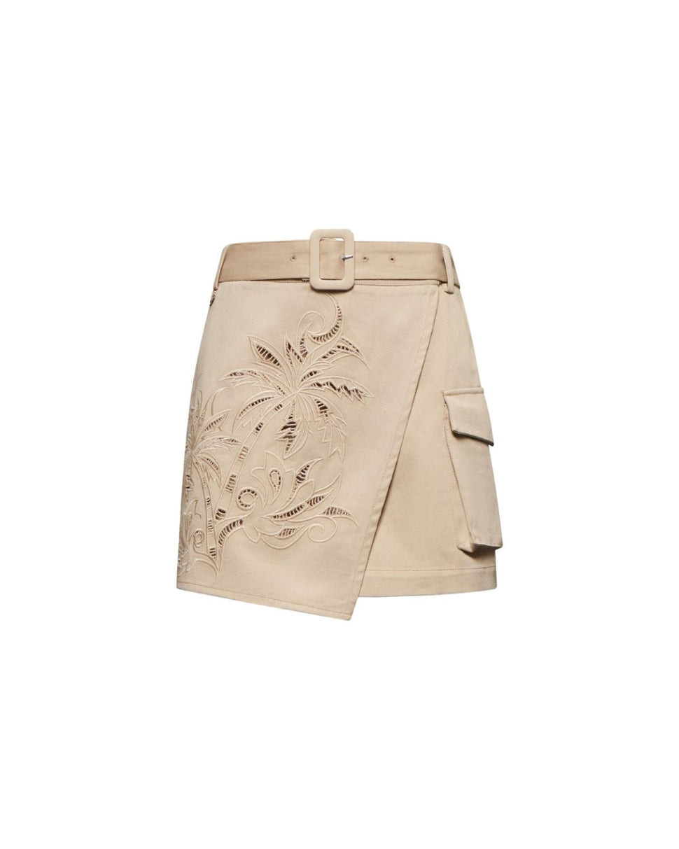 A perfect mix between utility style and female details. This cotton miniskirt has a refined perforated embroidery with tropical motif that adds a sophisticated touch to the structured design. The asymmetrical cut with wallet closure and lifetime belt enhances the silhouette, while the side cargo pockets give a modern and functional look. Ideal for casual-chic outfit with a decisive character.