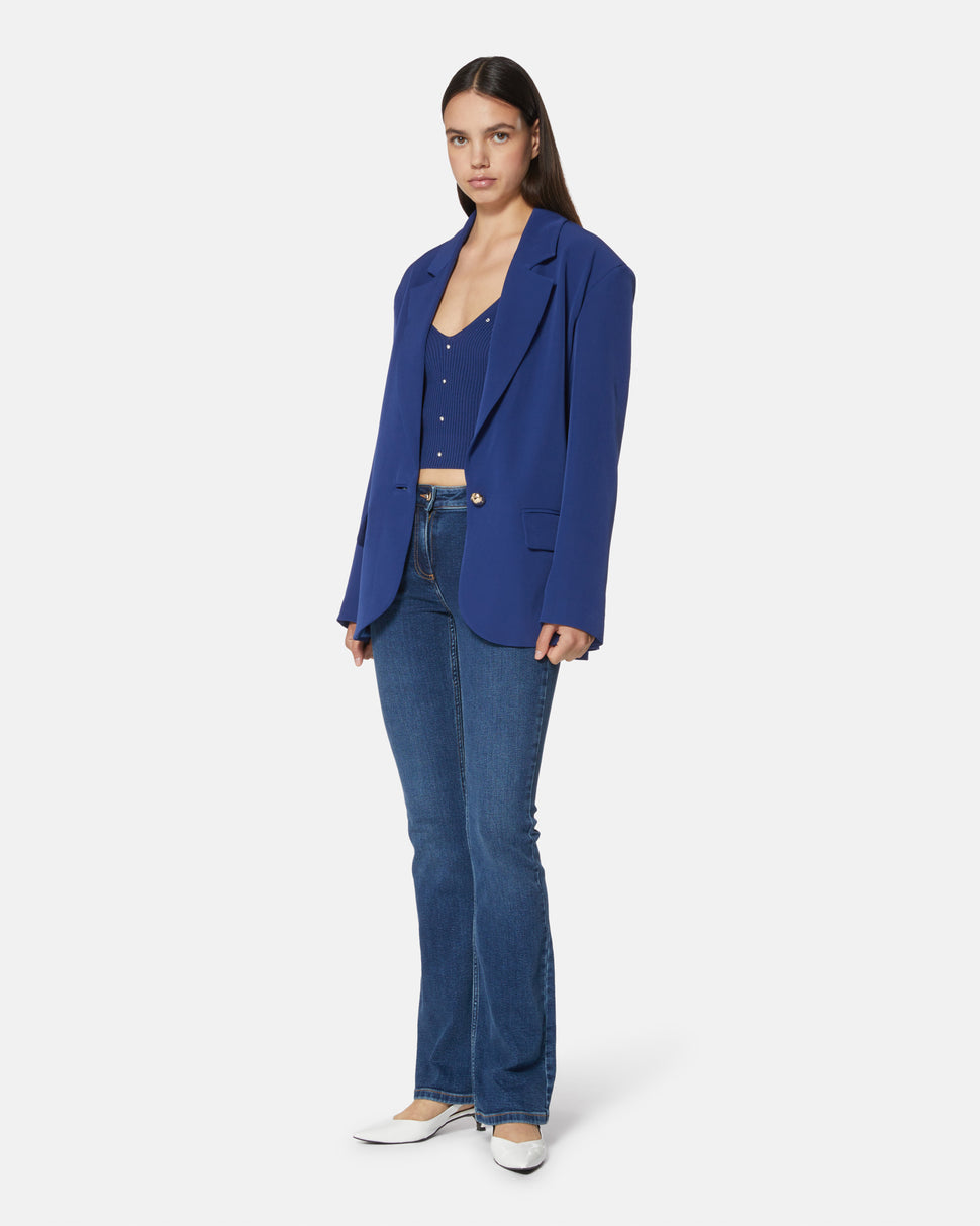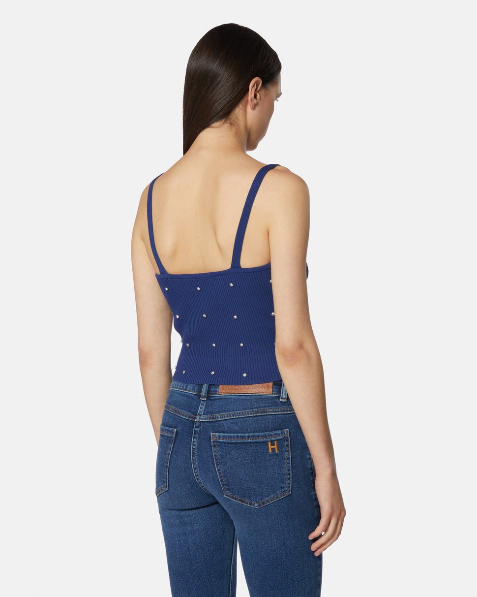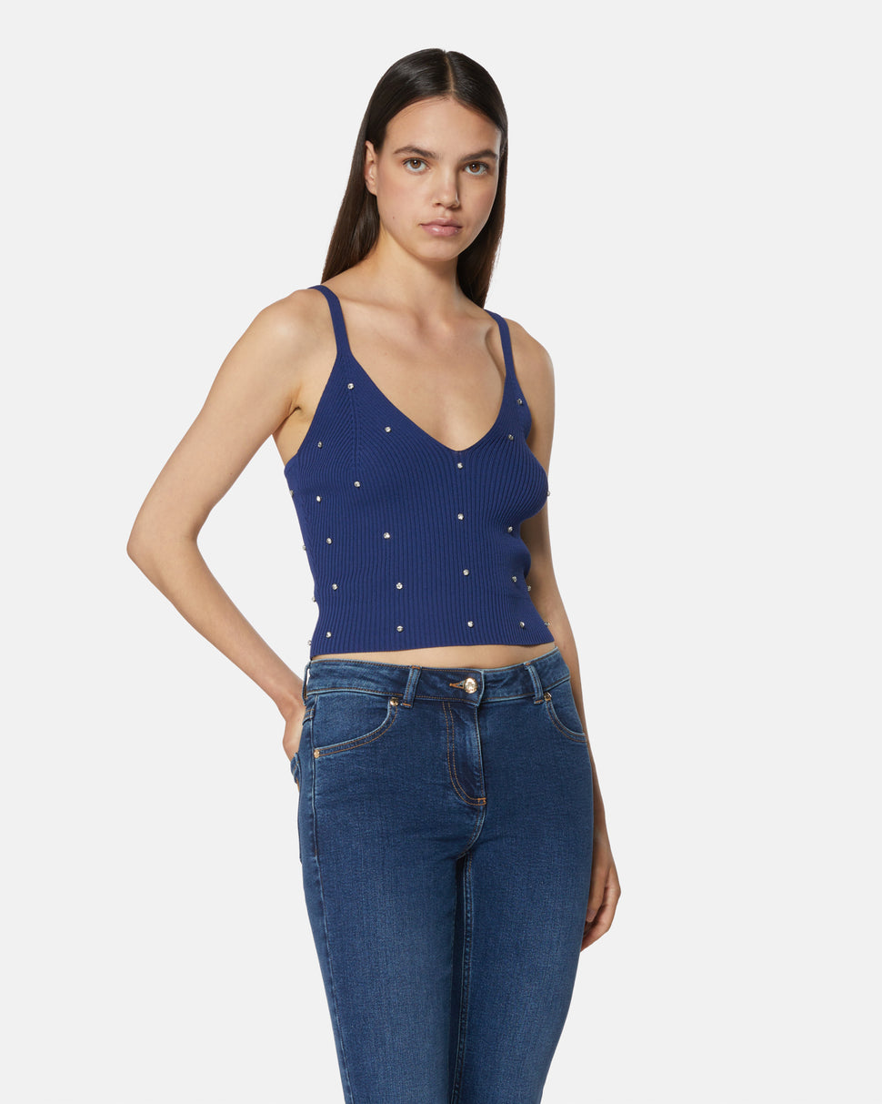 A female and sophisticated garment, perfect for adding a touch of light to your looks. This top in elasticized jersey presents a processing with applied ribs and pearls, for an elegant but versatile effect. To be combined with high -waisted trousers or skirts for a chic and modern outfit.