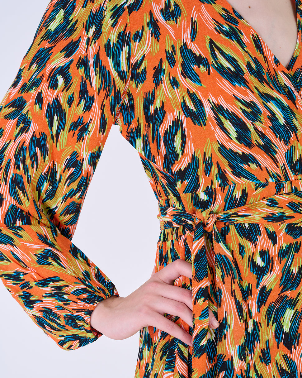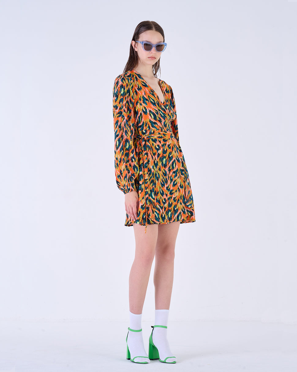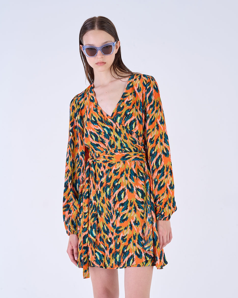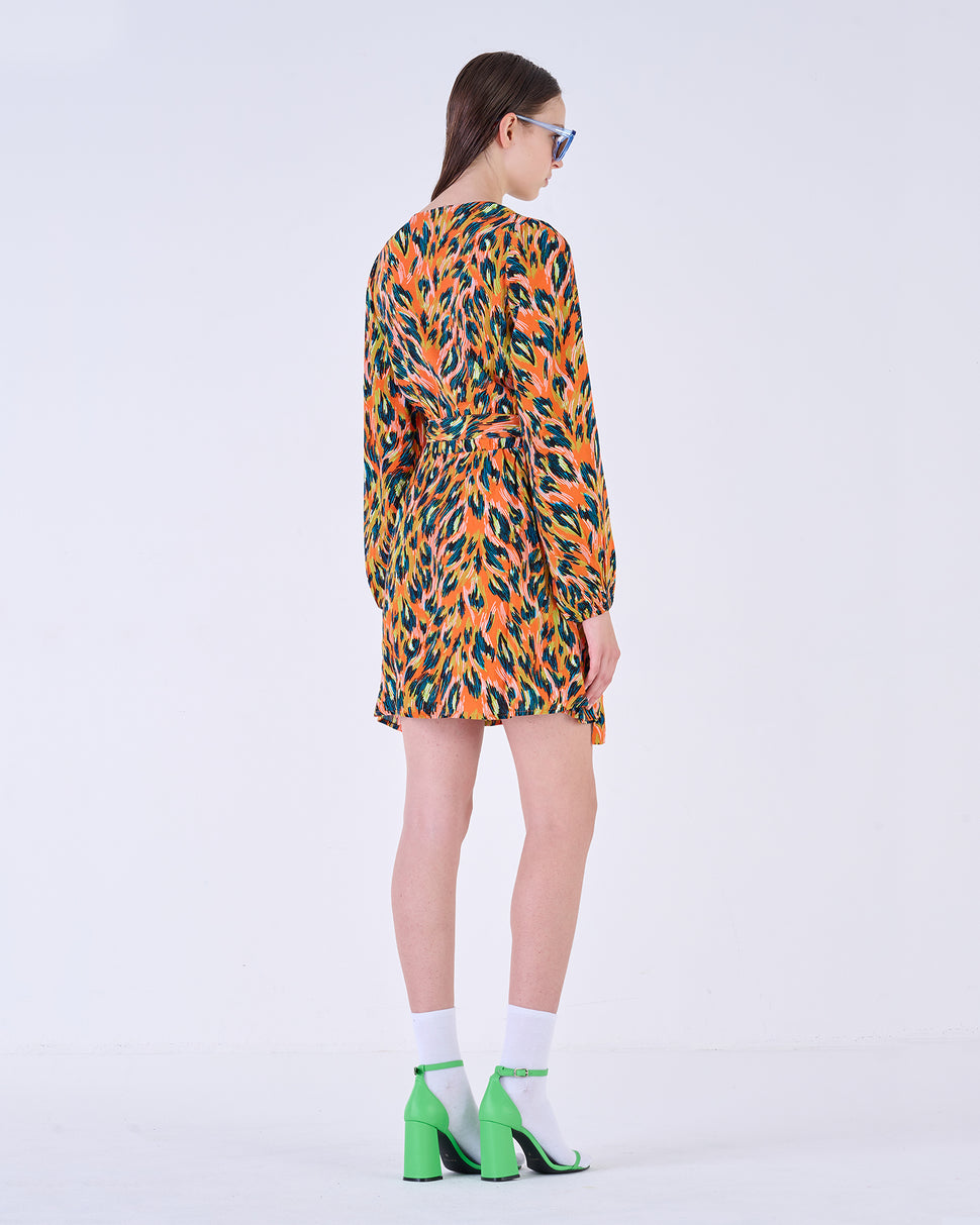 Maculed short dress with waist belt to tie. V -neck and long sleeves.