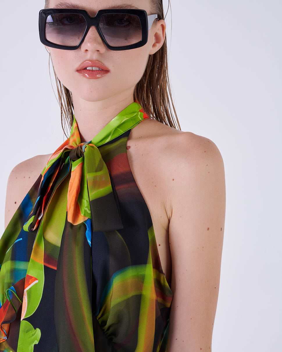 Short floral fantasy dress with ruffles. Nutworm detail.