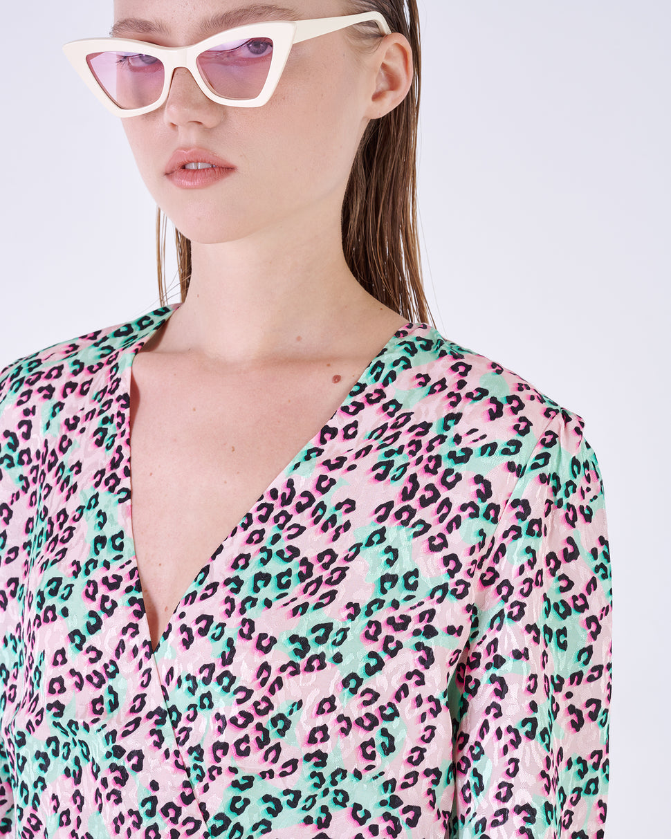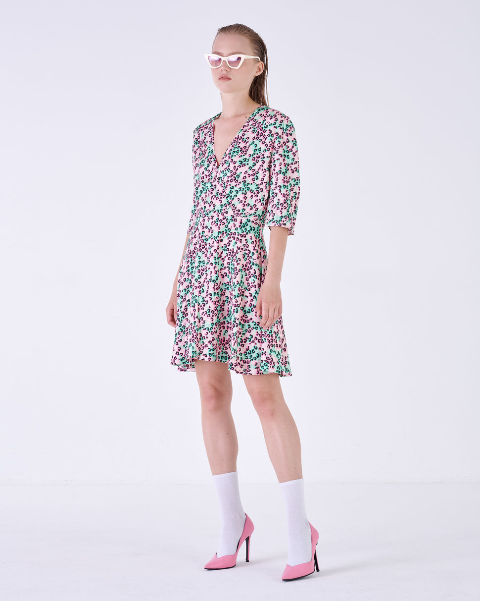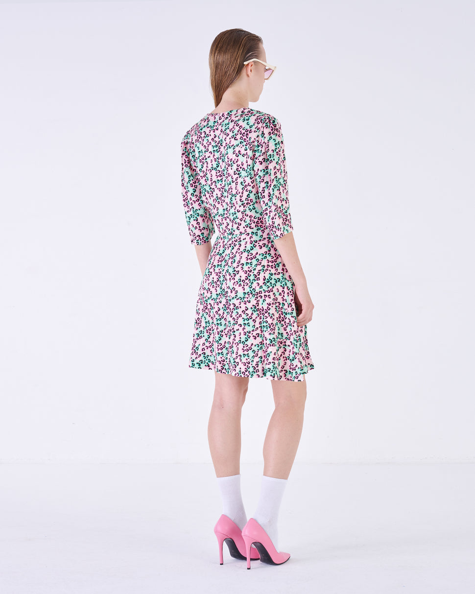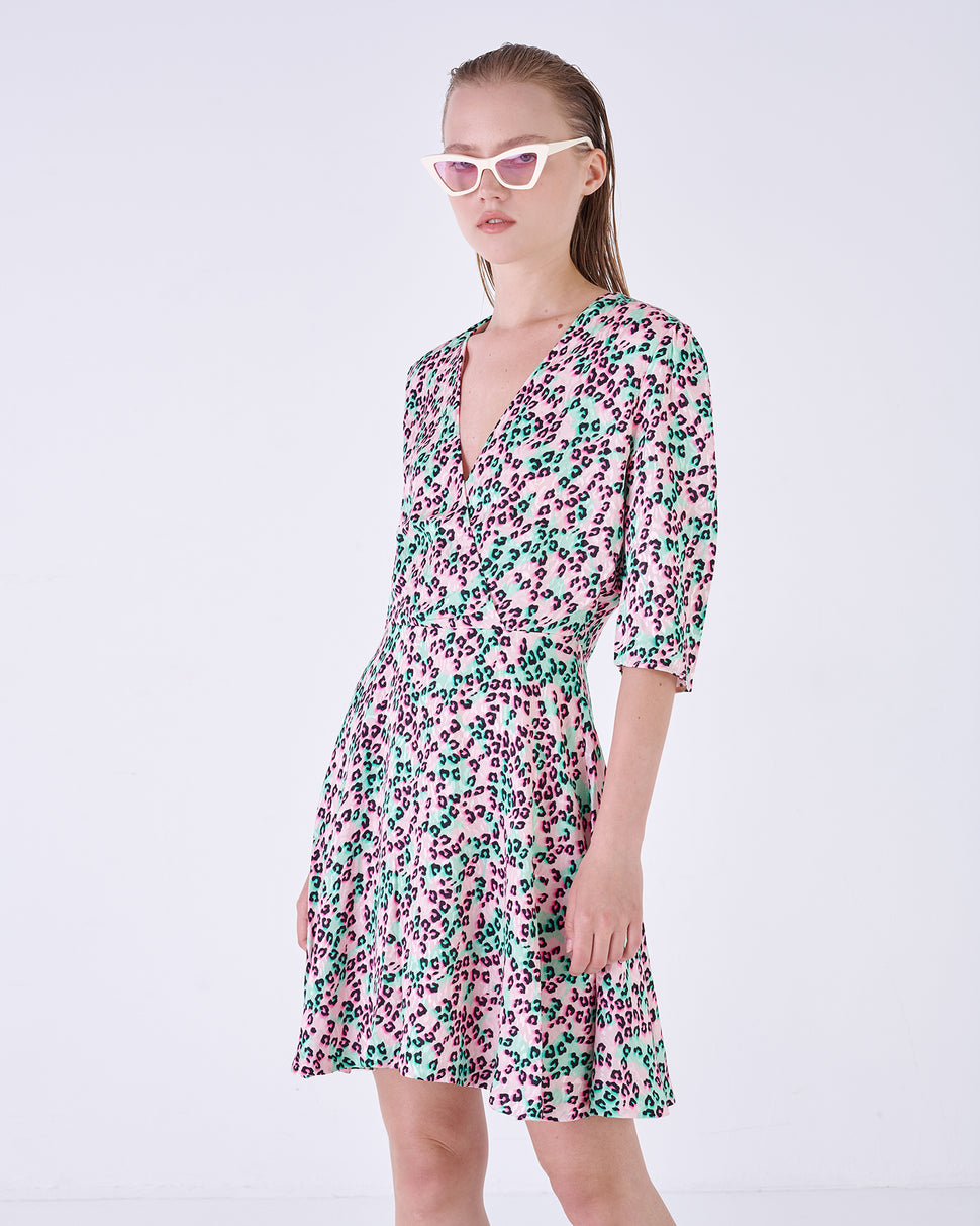 Short leopardized dress. Cross -colored V neckline and three -quarter sleeves.