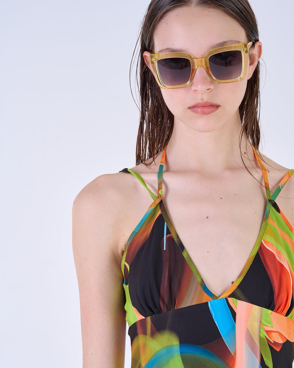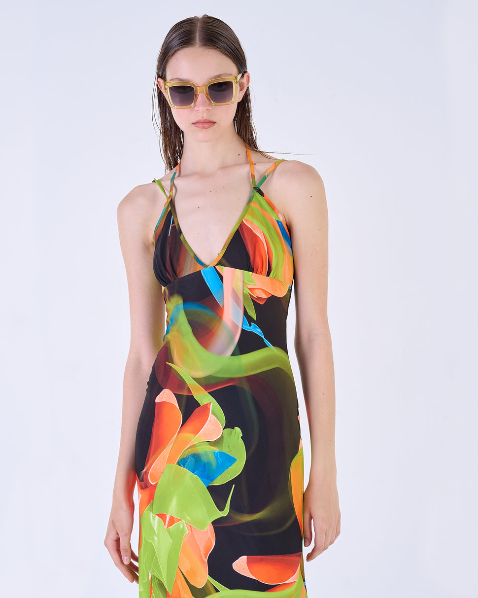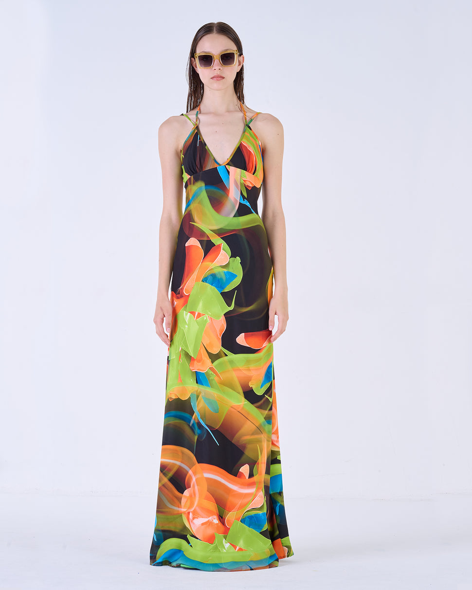 Long floral dress. V -neck with a knotable detail in the neck. Thin straps.