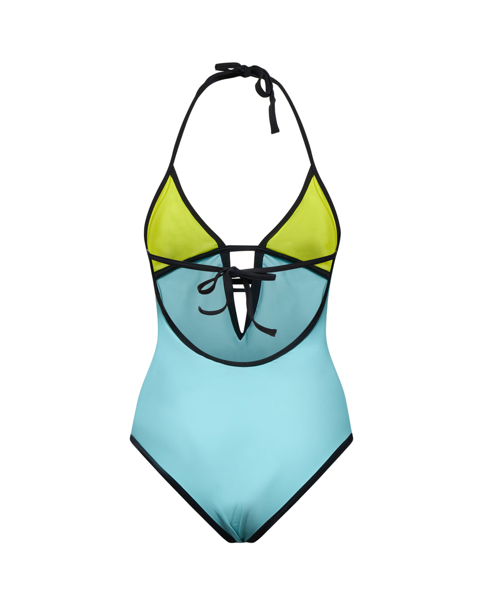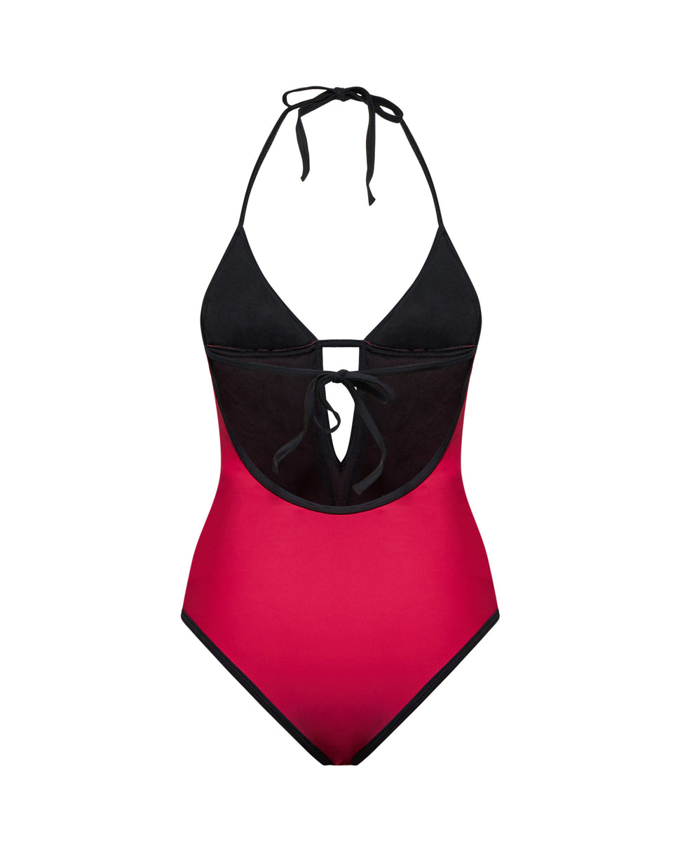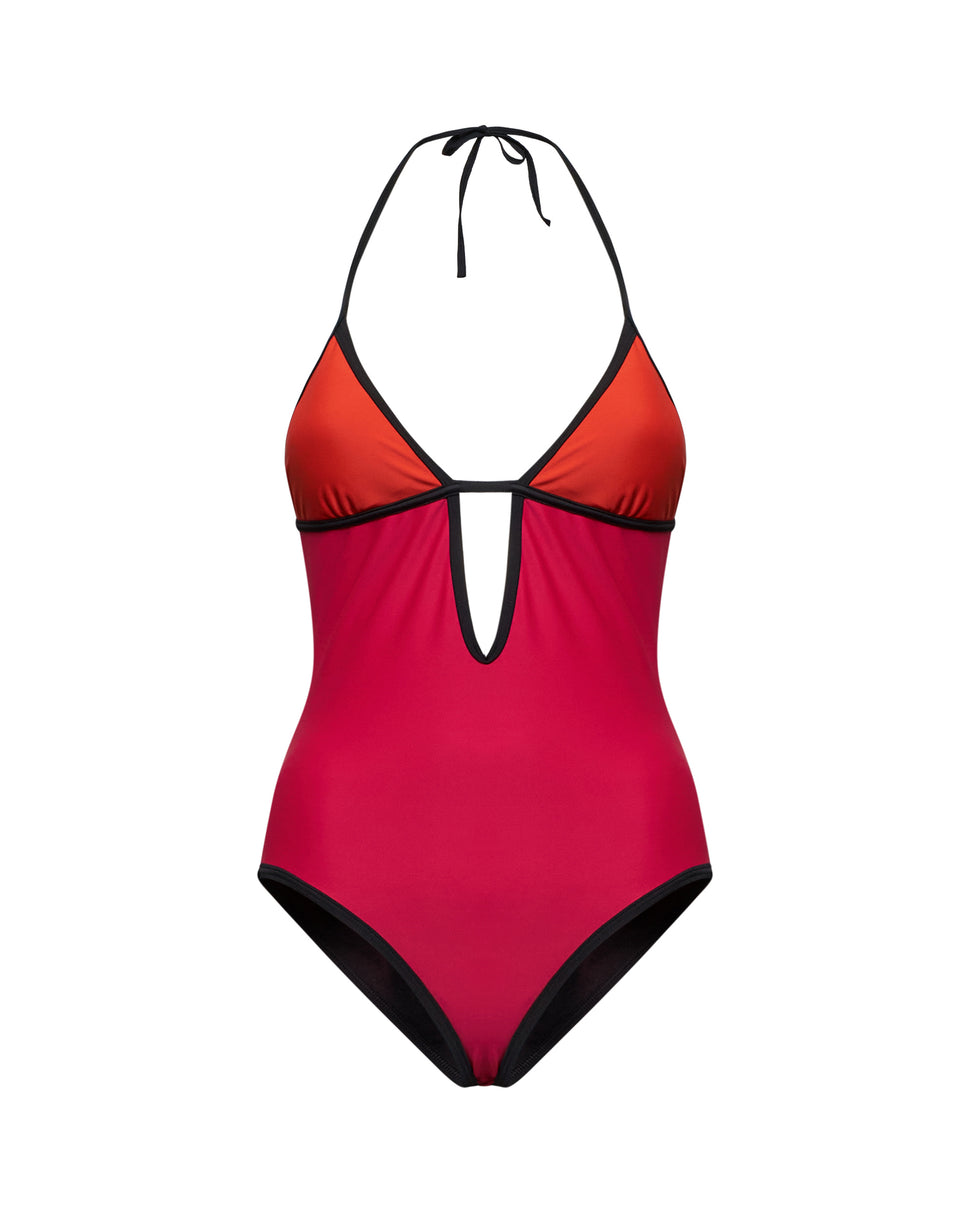 Seduction and style meet in this whole costume with a deep V -neckline. The mix of lively shades, finished by black contrasting profiles, enhances the silhouette with elegance and determination. Perfect for those who love to stand out, even on the beach.