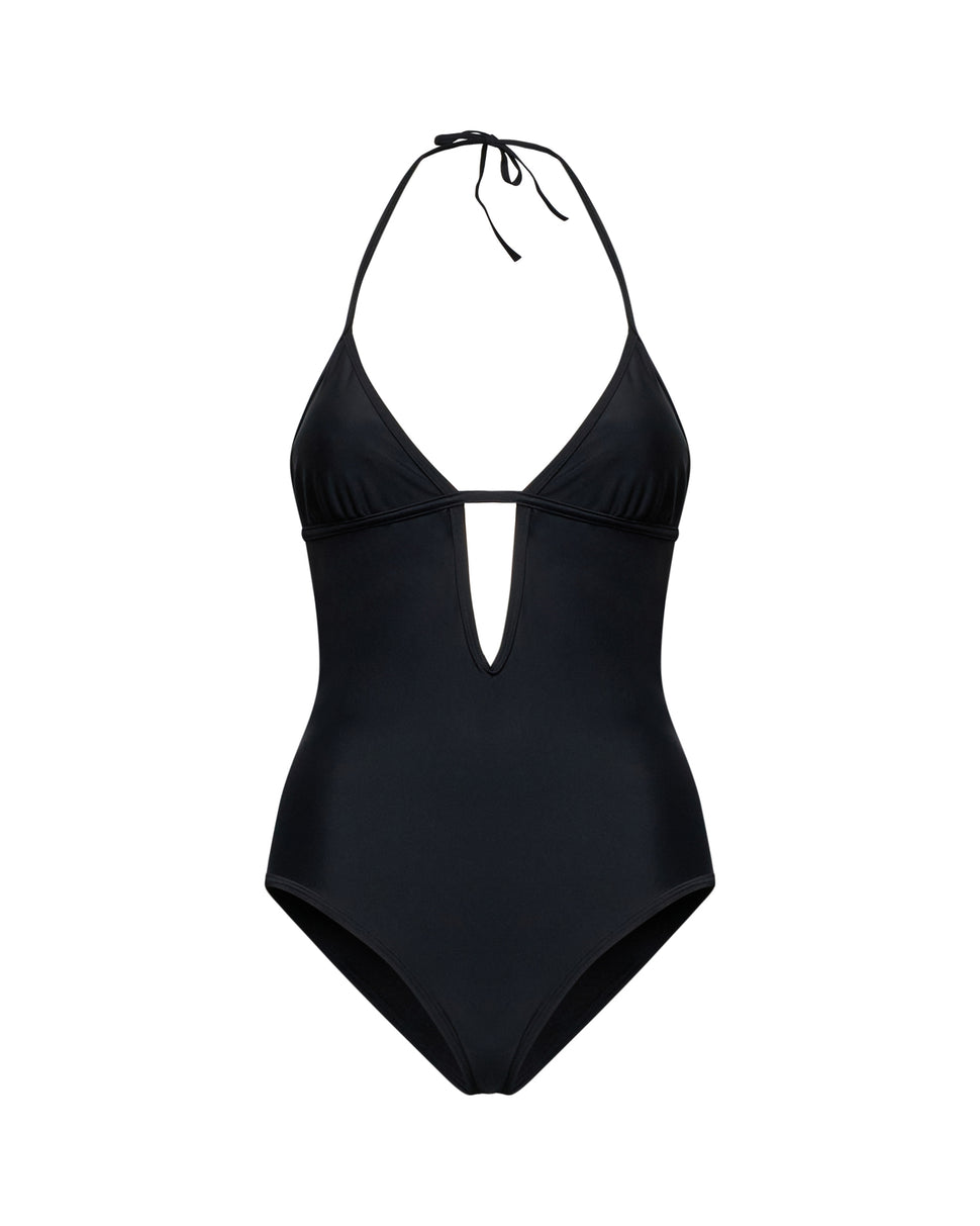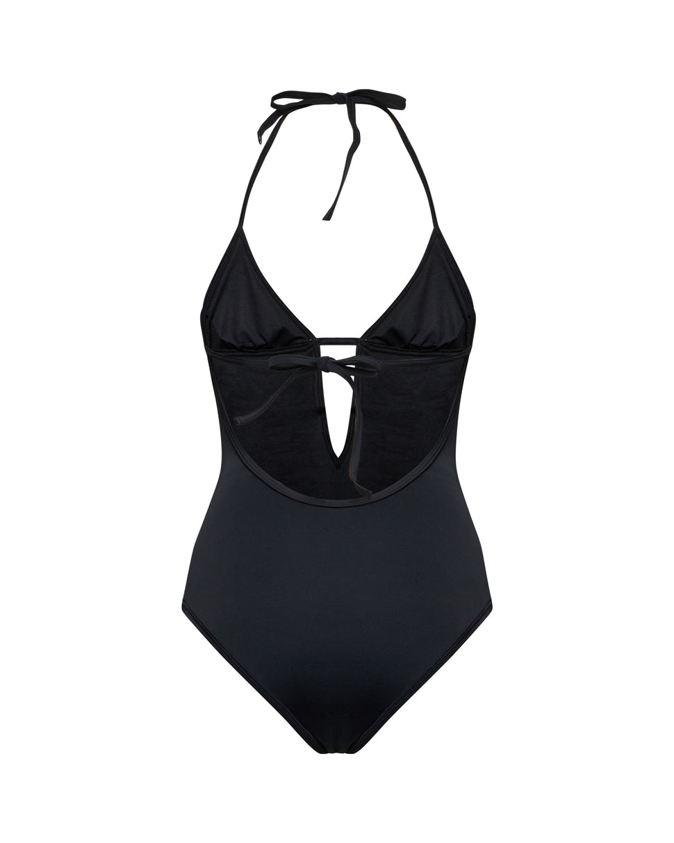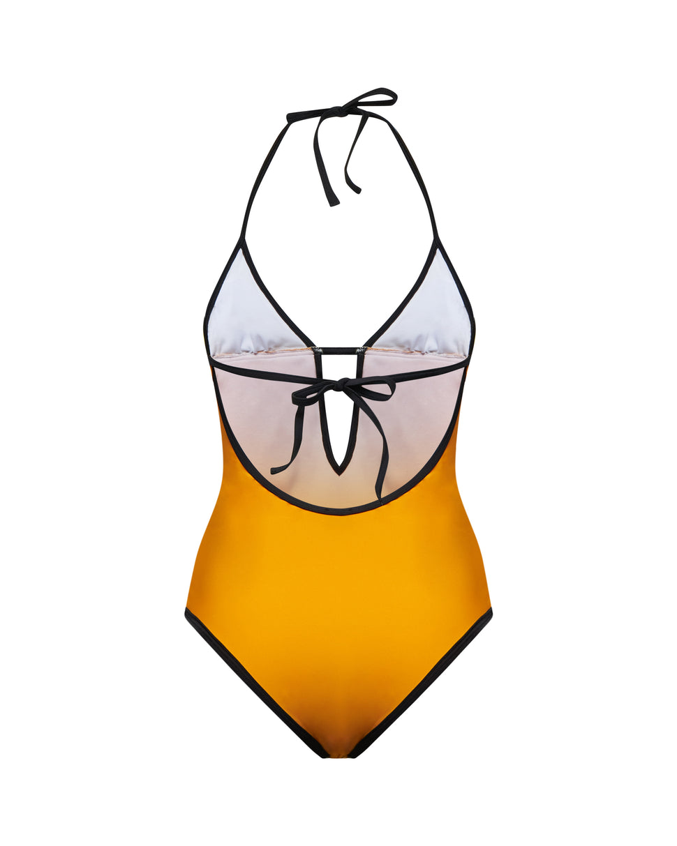 Seduction and style meet in this whole costume with a deep V -neckline. The mix of lively shades, finished by black contrasting profiles, enhances the silhouette with elegance and determination. Perfect for those who love to stand out, even on the beach.