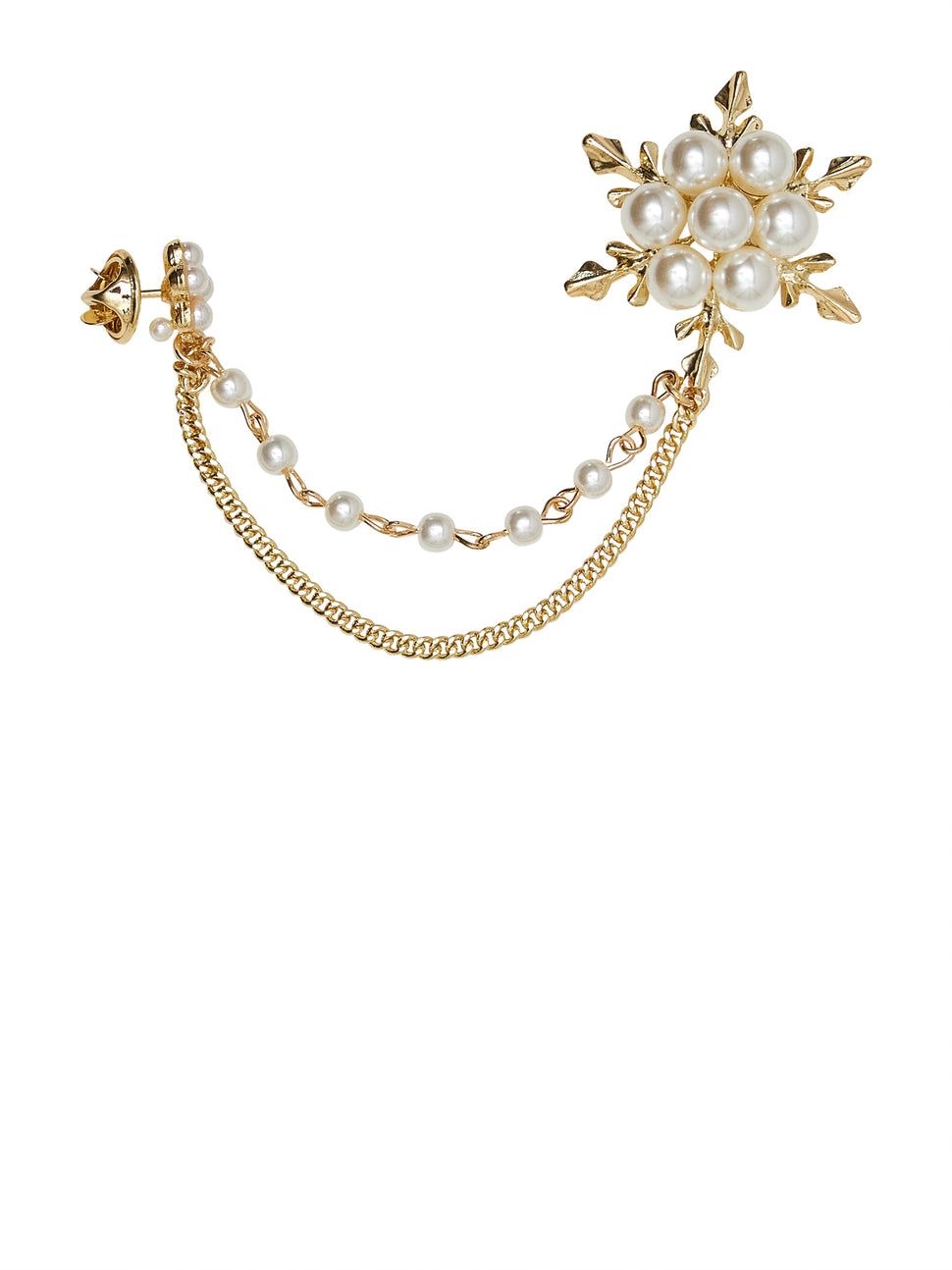 Questa spilla doppia interpreta un’eleganza sofisticata e decorativa, caratterizzata da una composizione floreale abbinata a una catena che crea un raffinato gioco di collegamenti. Il design equilibrato e la ricercatezza dei dettagli rendono l’accessorio un elemento distintivo, ideale per arricchire uno stile luxury con personalità e classe.