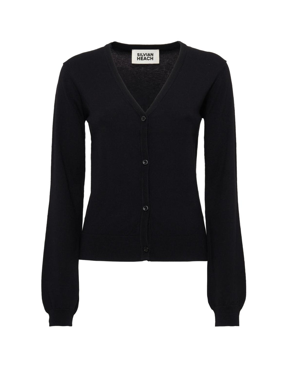 V-neck sweater with a clean cut. Front closure with tone-on-tone buttons and knit cuffs that add structure to the garment.