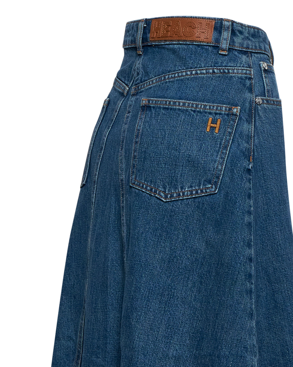 A denim midi skirt with a center front slit. Clean lines, a straight silhouette, and utility inspiration.