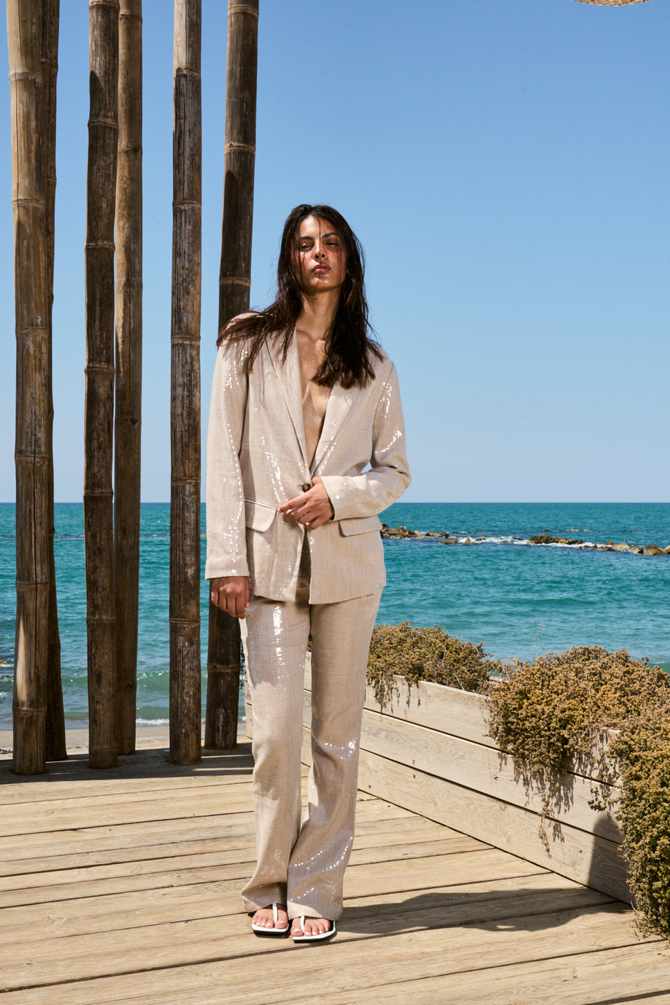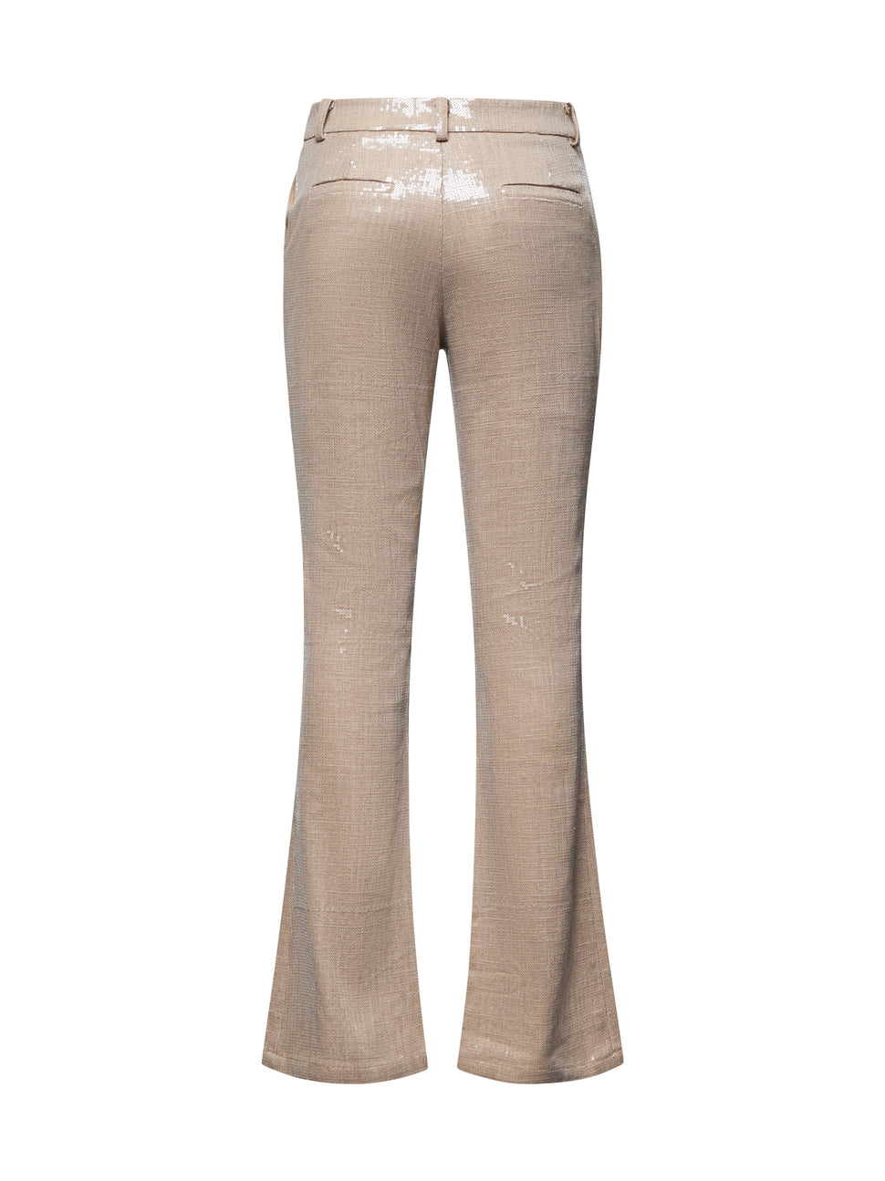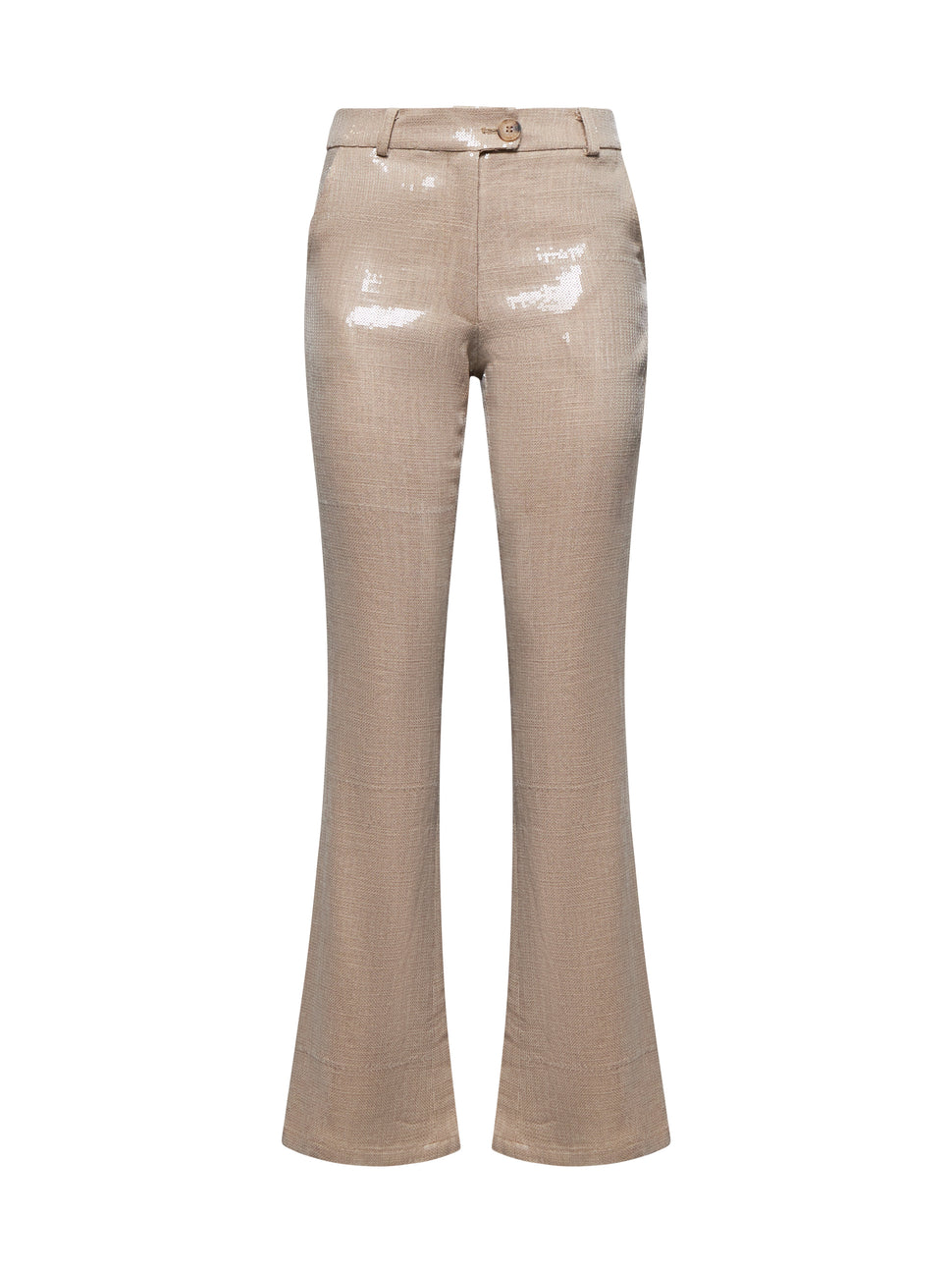 Flag pants with sequin and impactful design sequins, perfect for a glamorous and refined look. The tailoring structure enhances the silhouette, while the elephant paw model gives a retro touch reinterpreted in a modern key. Made with bright sequins, they capture the light and give brilliance to every movement. Closure with button and passers -by in life for an adjustable fit and well -kept details that enhance the style of the garment.