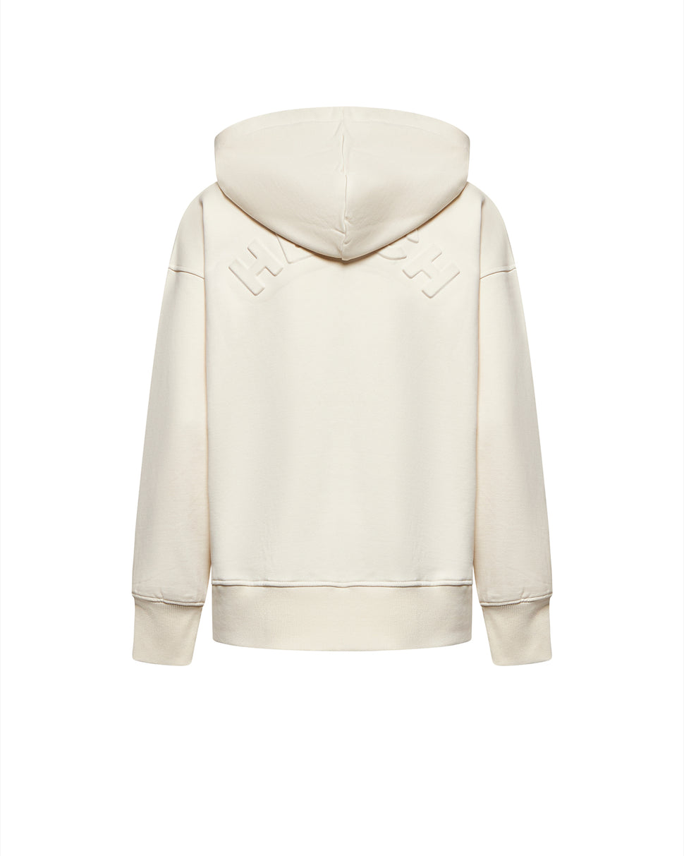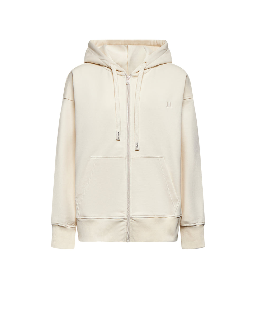 Felpa con cappuccio regolabile, zip centrale e tasca a marsupio. Una proposta essenziale con dettagli funzionali.