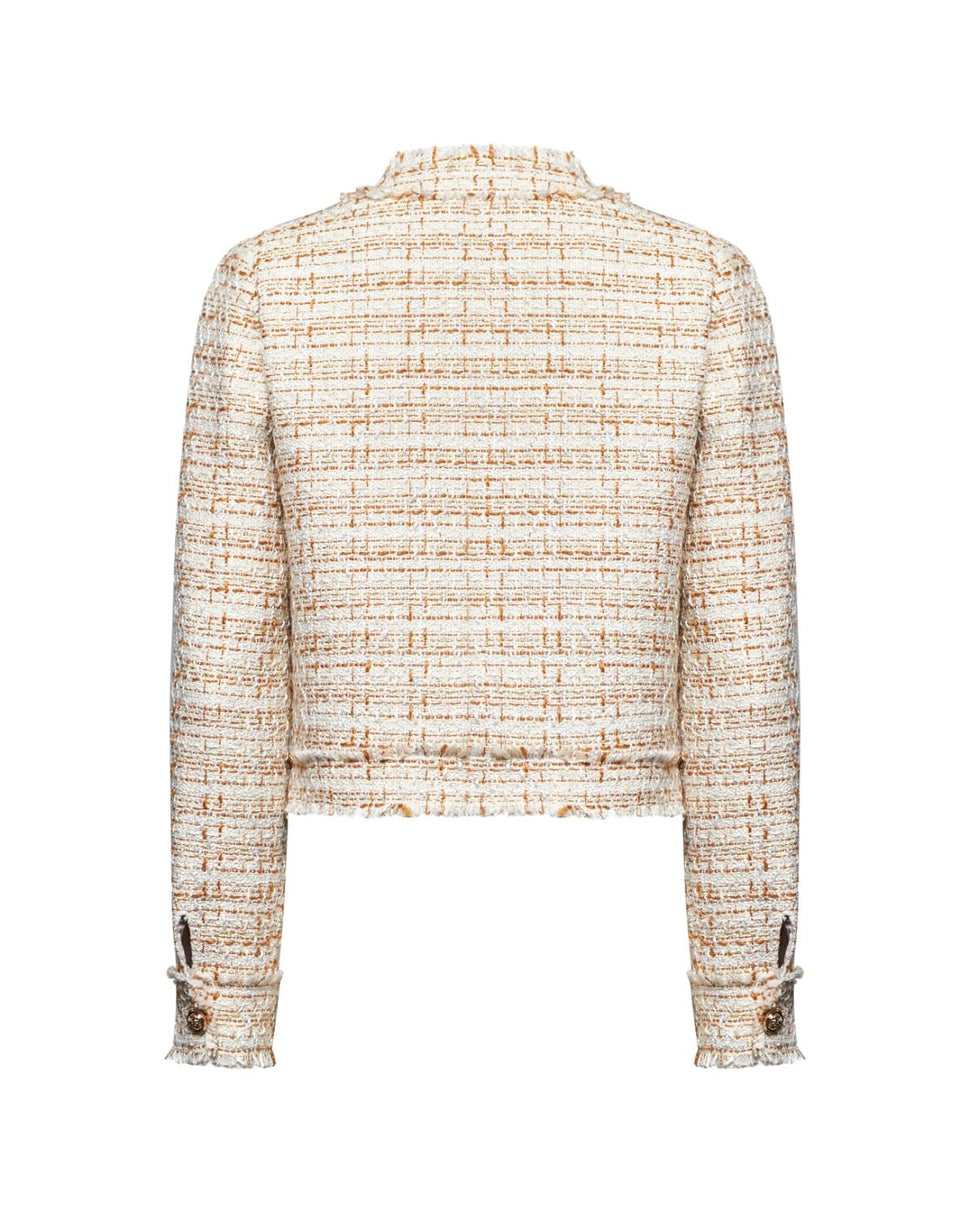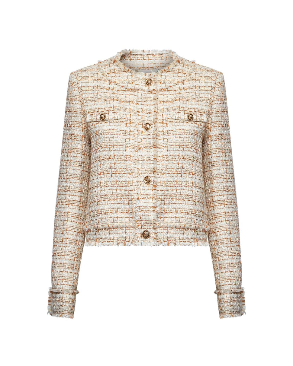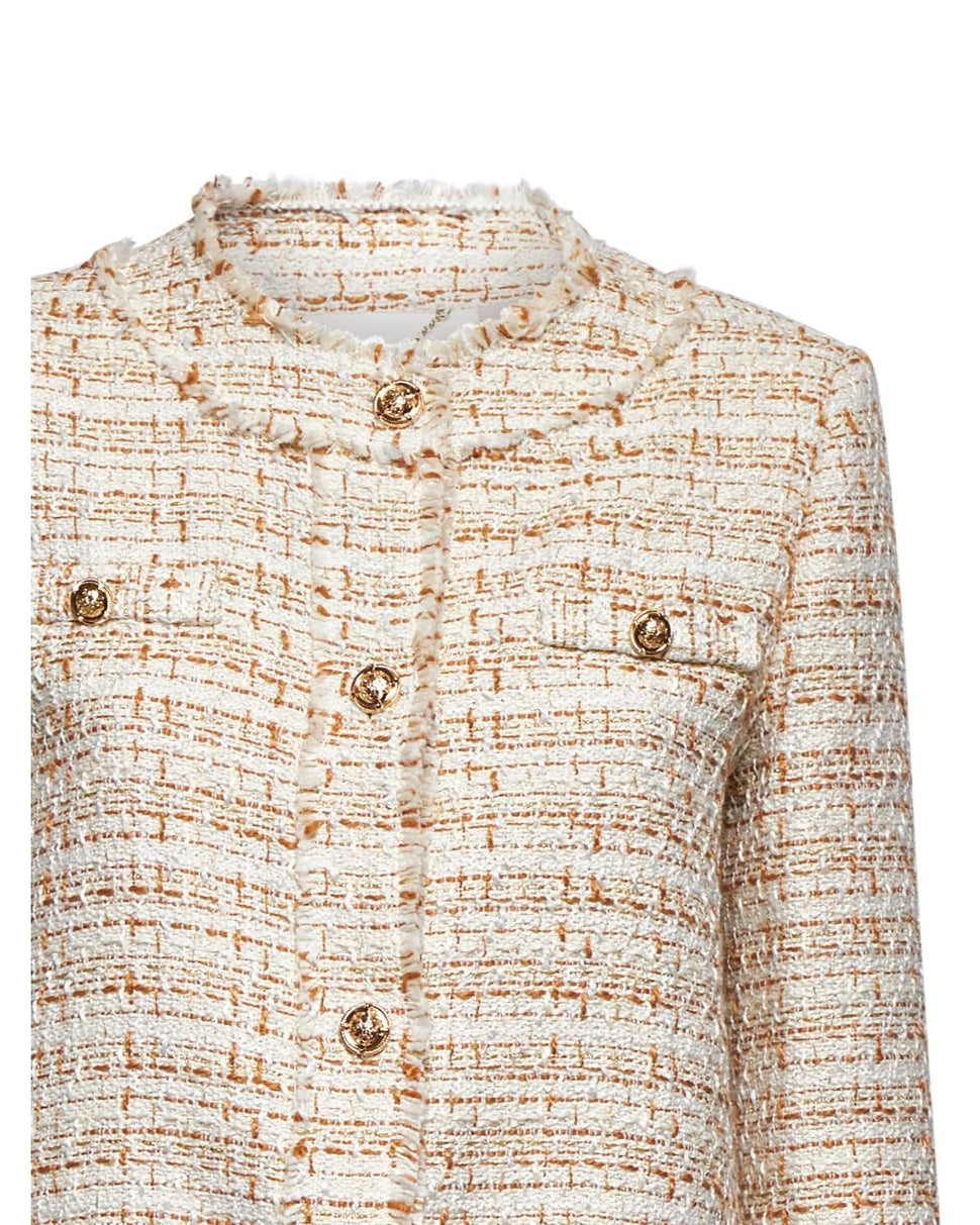 Classica giacca in tweed con bottoni decorativi dorati e linea dritta. Uno dei capi iconici del guardaroba formale, rivisitato con delicatezza.